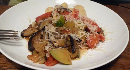 Gnocchis mit Auberginen, Rondinis und Tomaten, in Olivenöl geschmört – aus der Pfanne, je nach Belieben mit geriebenenm Emmentaler